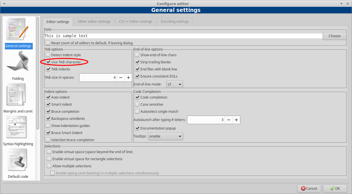 Before editing any files, remember that all code needs to comply with the doc_code_style_guidelines. One important difference with Godot is the use of tabs for indents. Therefore, the key default editor setting that needs to be changed in Code::Blocks is to enable tabs for indents. This setting can be found by selecting Settings > Editor.