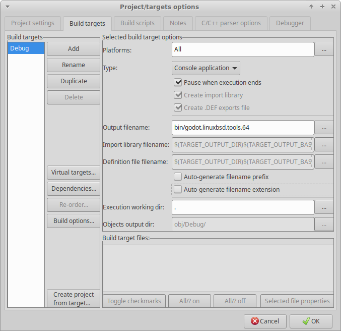 There are two additional points worth noting. First, if required, the Execution working dir field can be used to test specific projects, by setting it to the folder containing the project.godot file. Second, the Build targets tab can be used to add and remove build targets for working with and creating different builds.