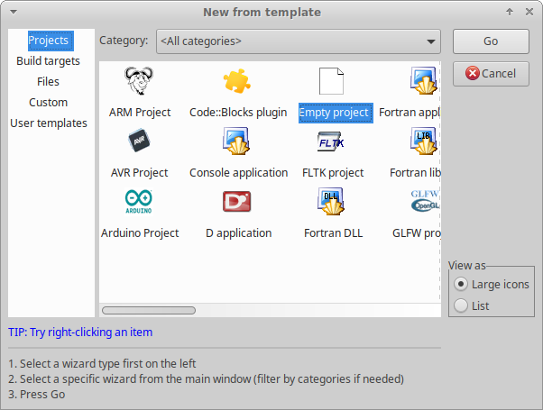 From Code::Blocks' main screen, click Create a new project or select File > New > Project....