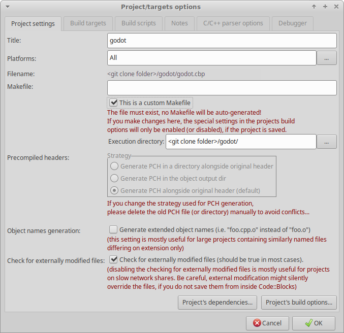 That's it. You're ready to start contributing to Godot using the Code::Blocks IDE. Remember to save the project file and the Workspace. If you run into any issues, ask for help in one of Godot's community channels.