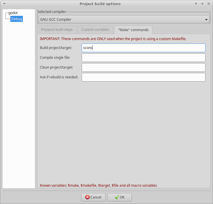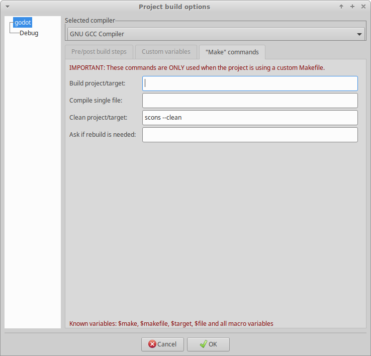 Select the "Make" commands tab and remove all the existing commands for all the build targets. For each build target enter the SCons command for creating the desired build in the Build project/target field. The minimum is scons. For details on the SCons build options, see doc_introduction_to_the_buildsystem. It's also useful to add the scons --clean command in the Clean project/target field to the project's default commands.